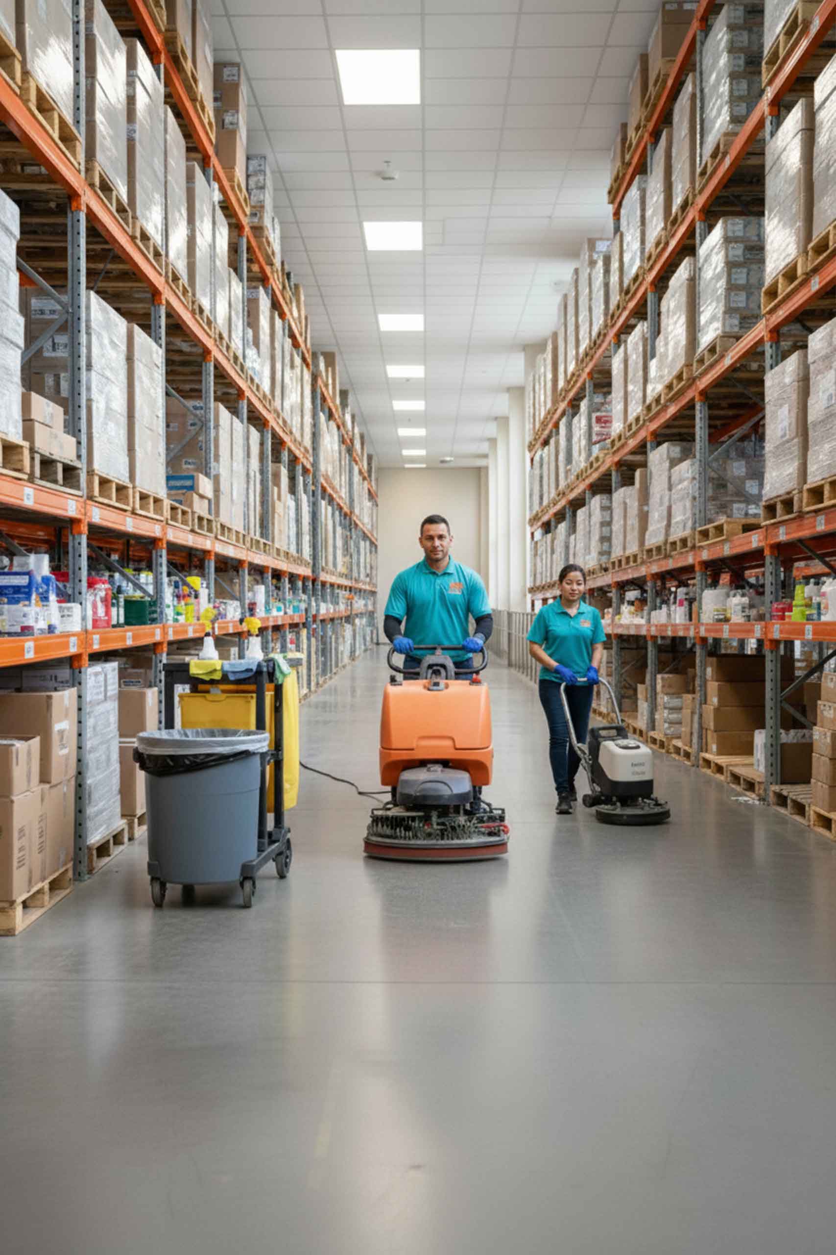It depends on foot traffic, forklift movement, and storage conditions. Many warehouses schedule daily janitorial for breakrooms/restrooms and weekly or monthly deep floor cleaning.